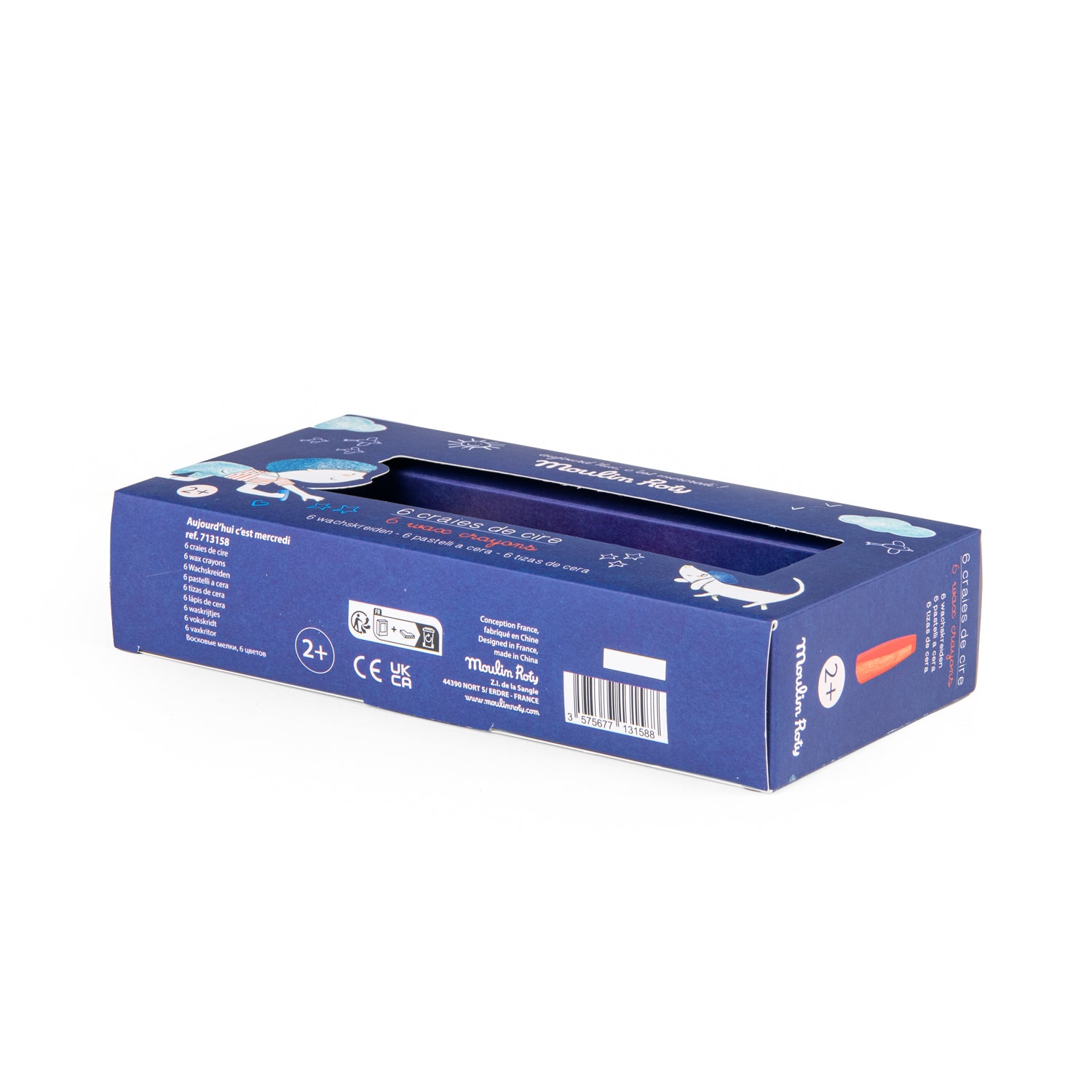 En æske med seks farvestrålende voksfarveblyanter til spirende kunstnere! Deres unikke form sikrer et behageligt greb og glatte, farverige streger. De er fremstillet af bivoks, smitter ikke og er nemme at rengøre, hvilket gør dem perfekte til små hænder.